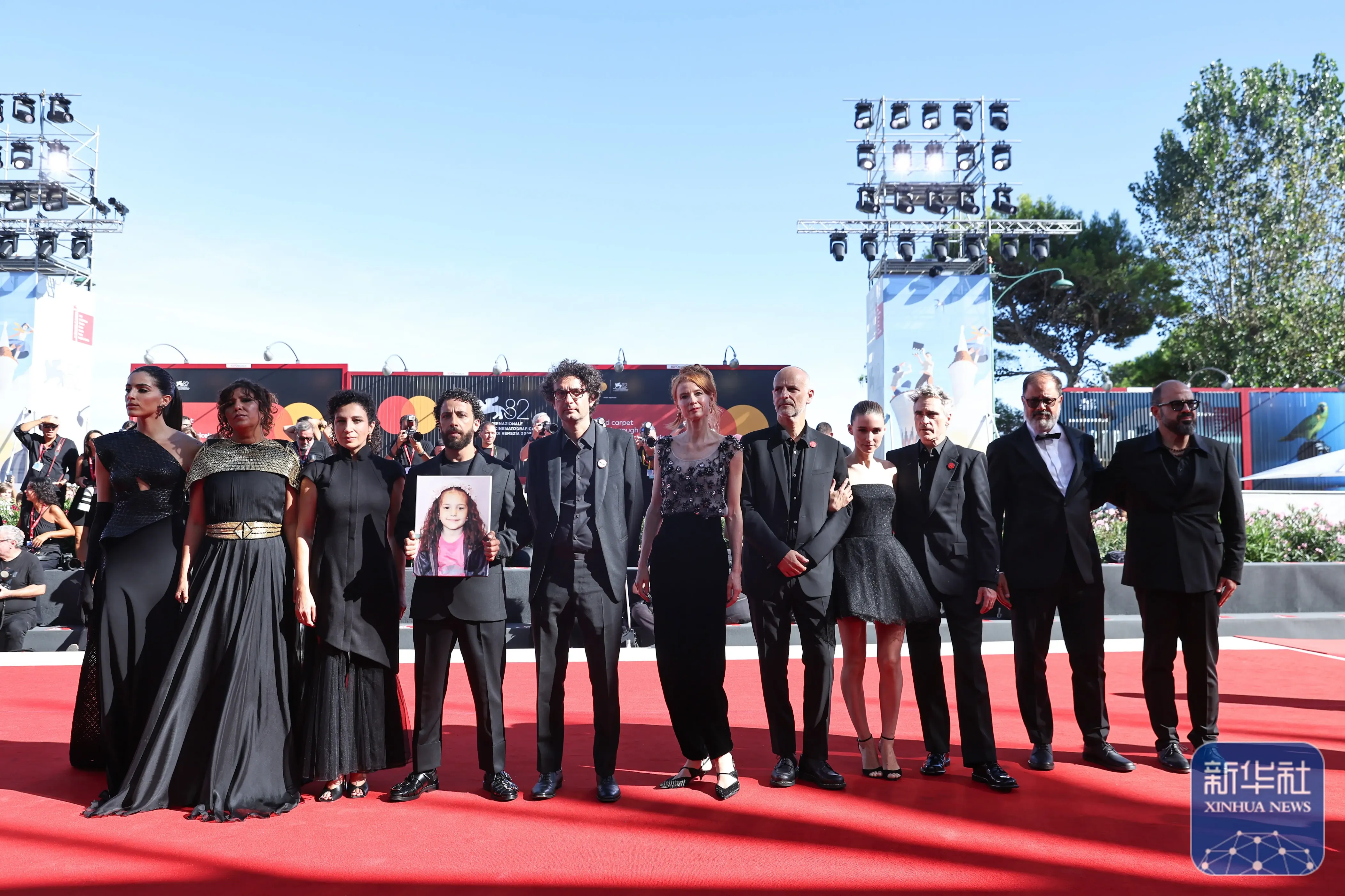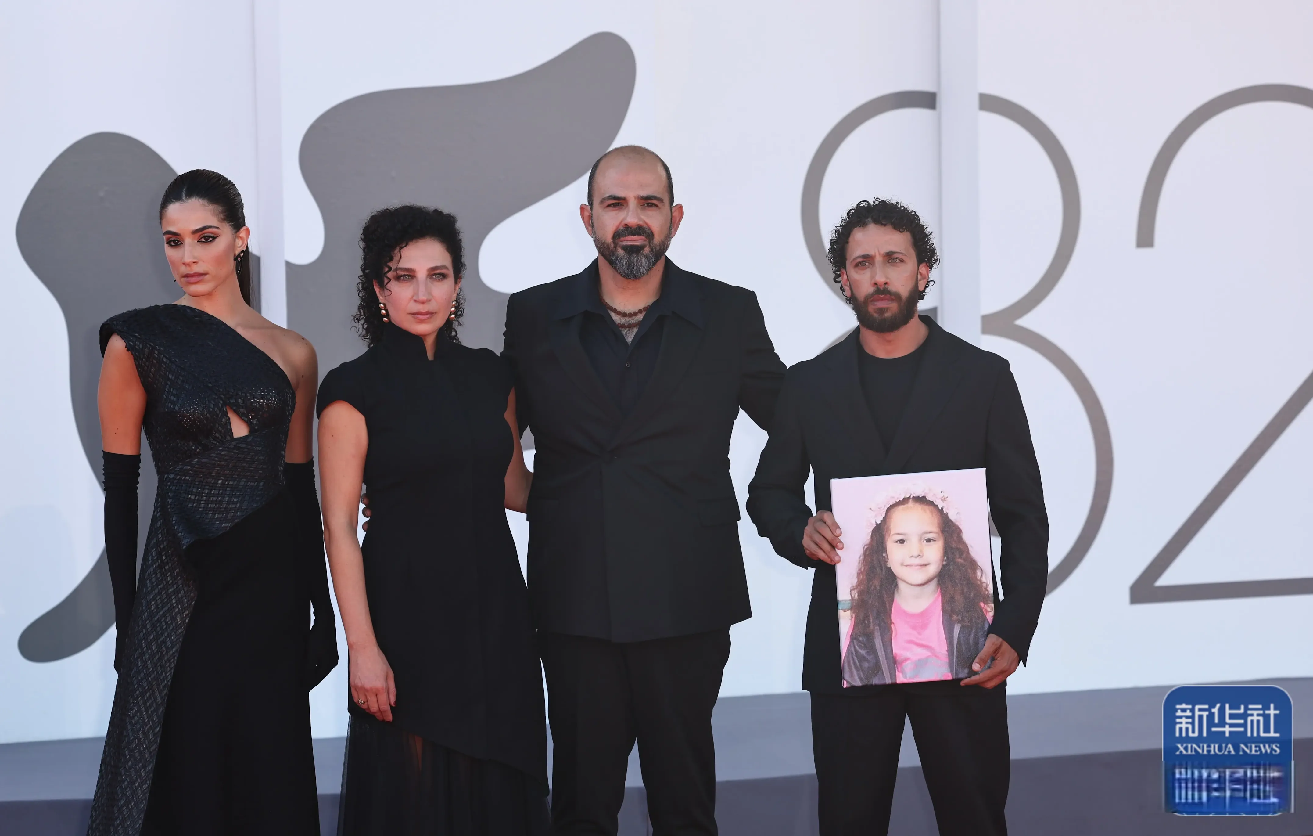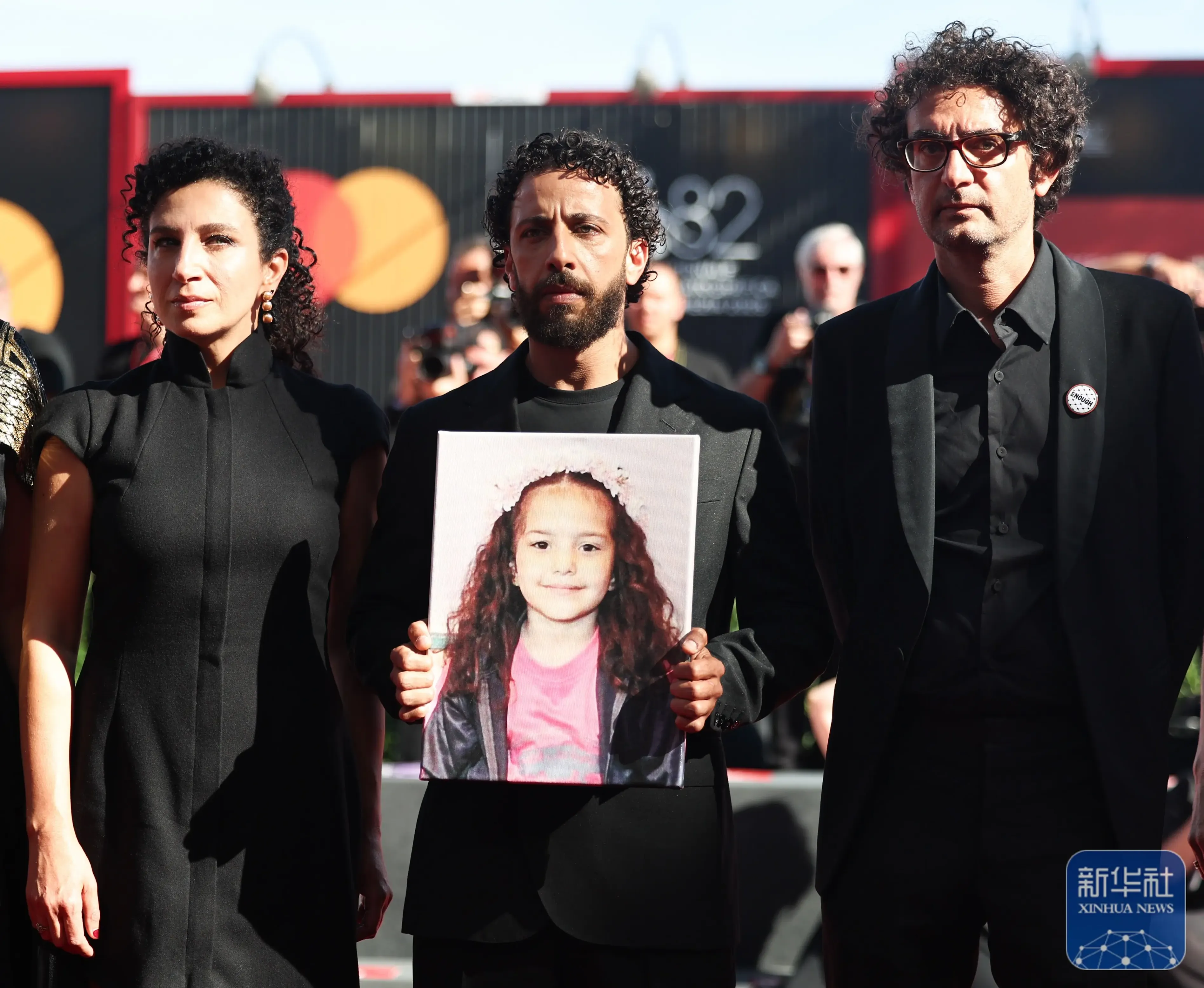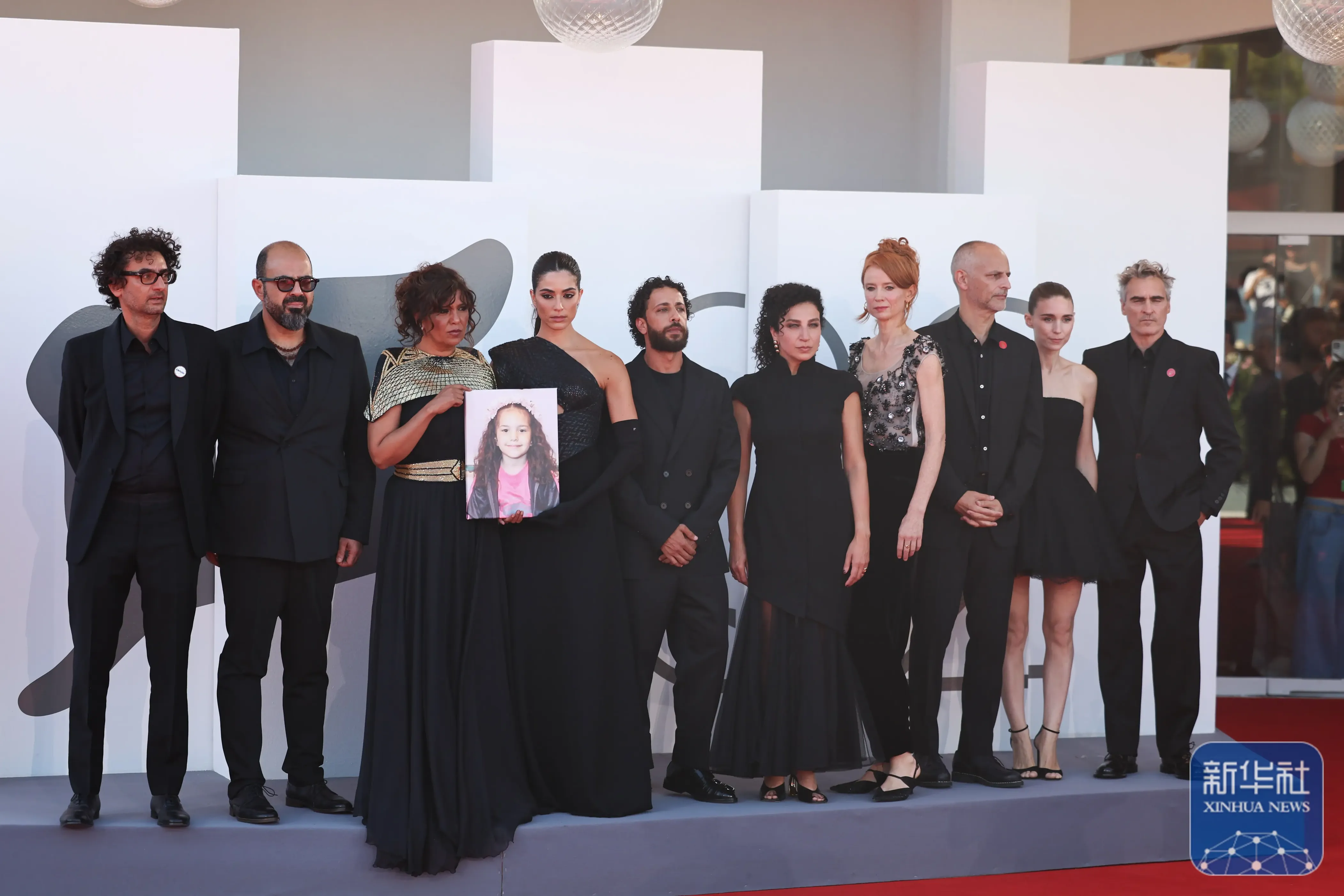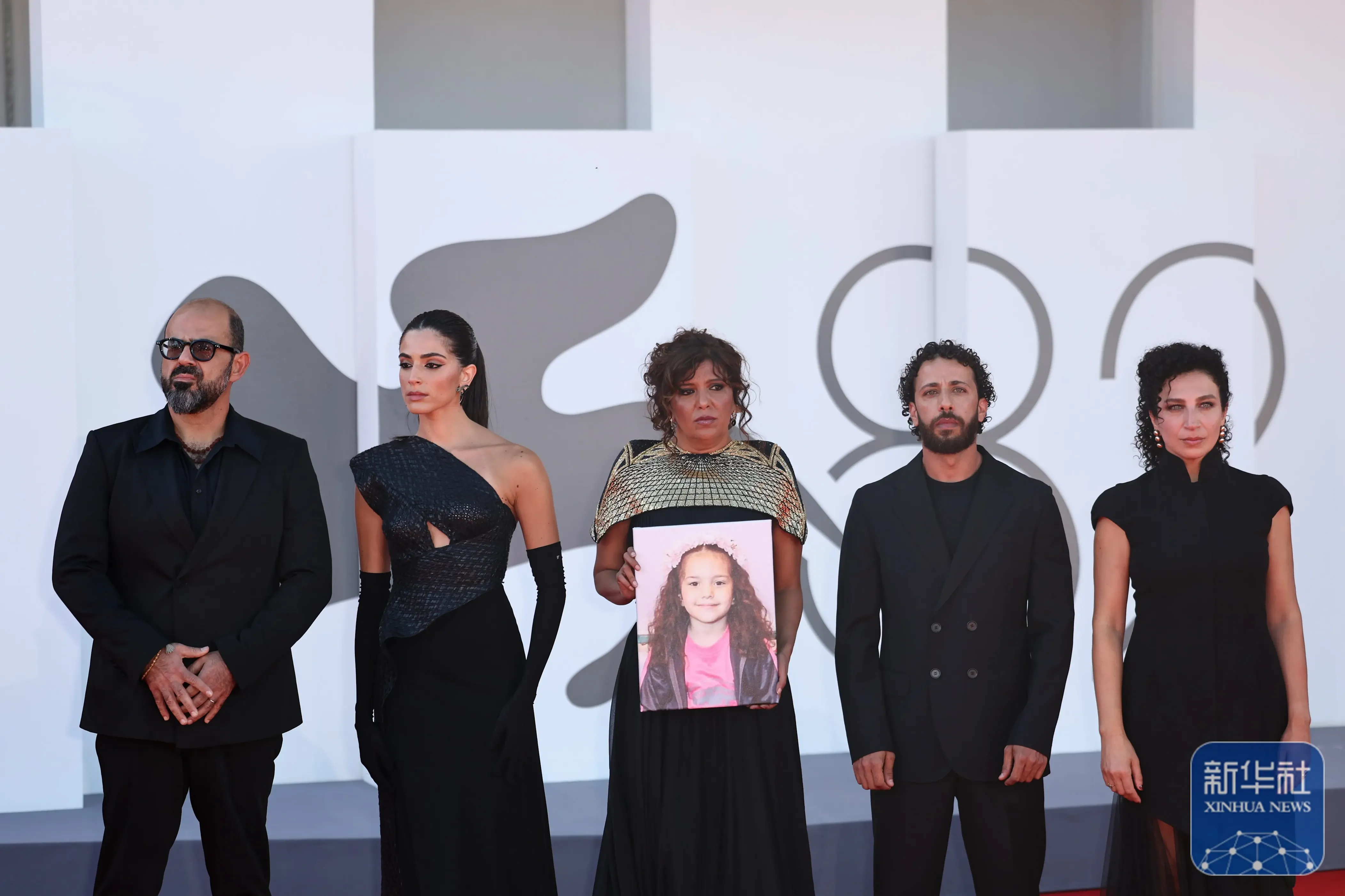 ↑9月3日,在意大利威尼斯,电影《欣德·拉贾布之声》主创人员手持影片角色原型欣德·拉贾布的照片出席首映式。