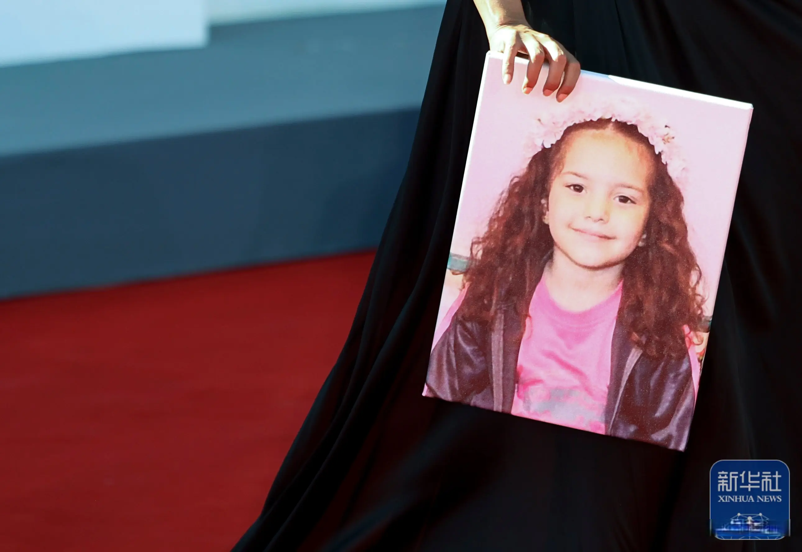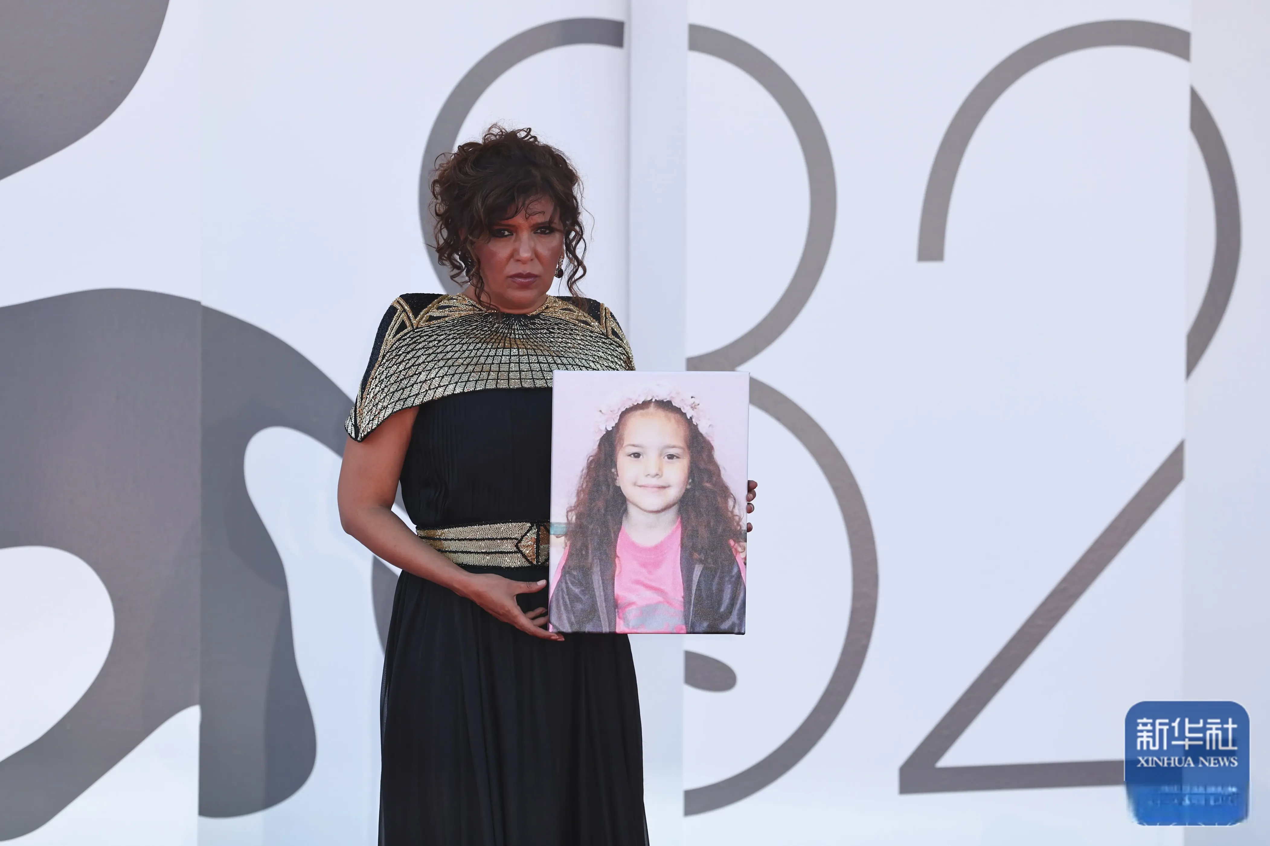 ↑9月3日,在意大利威尼斯,电影《欣德·拉贾布之声》导演卡乌塞尔·本·哈尼娅手持影片角色原型欣德·拉贾布的照片出席首映式。
