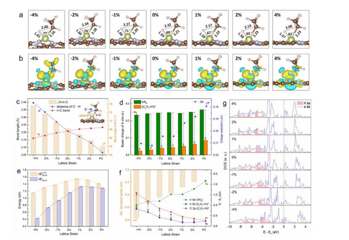 机械应变通过改变催化剂晶格参数引发键长/键角的重构,直接调制材料的电子结构:拉伸应变使d带中心上移增强吸附能,压缩应变则通过轨道压缩效应降低反键轨道占据数,这种应变工程可系统优化反应中间体的结合强度。